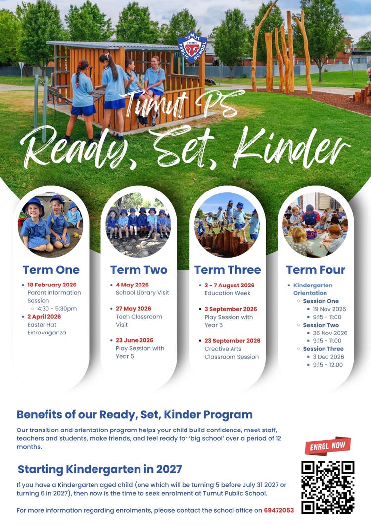 If you have a Kindergarten aged child (one which will be turning 5 before July 31 or turning 6 in 2027), then now is the time to seek enrolment at Tumut Public School.